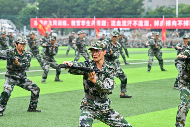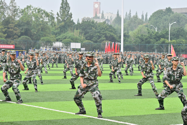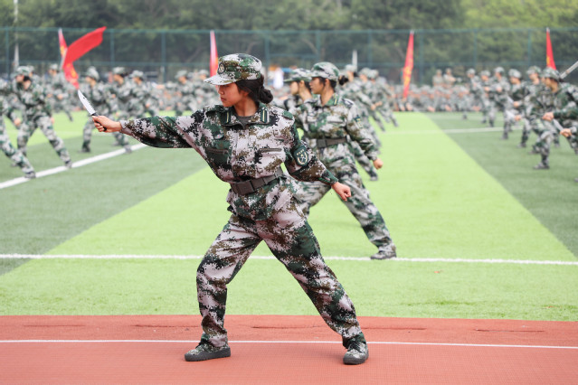 紧跟分列式的激情,军训汇报表演正式开始。教官一声声令下,展示方阵动作整齐,一个个招式沉着有力。军体拳由拳打、脚踢、摔打、夺刀、夺枪等格斗动作组合而成,铿锵有力,展现了军人坚韧不拔、勇敢顽强的战斗作风;匕首术每个动作都伴随着一声“杀”,干净利落,霸气十足;刺杀操方同学们手握重枪、英姿不凡,每个动作都精准到位,每声呐喊都恢宏有力;健美操集体操、舞蹈、音乐、健身、娱乐为一体,满是活力,洋溢着青春灵动。新生们的风采赢得阵阵掌声,现场气氛火热朝天。