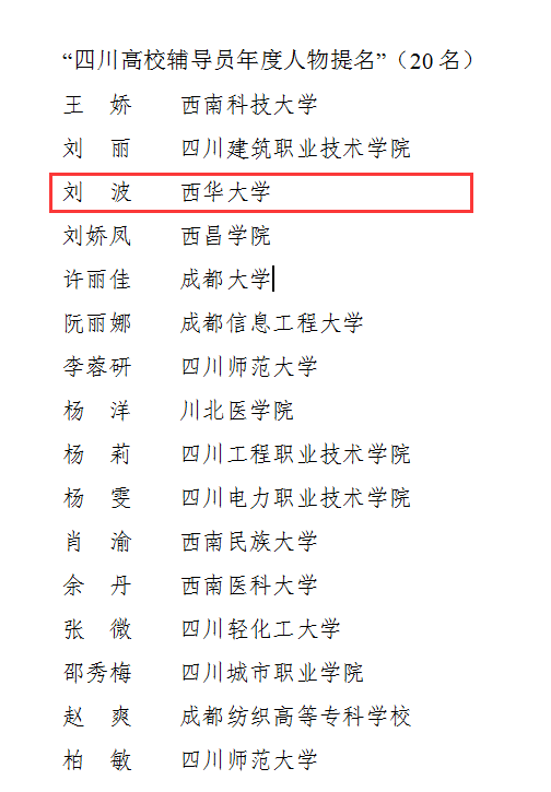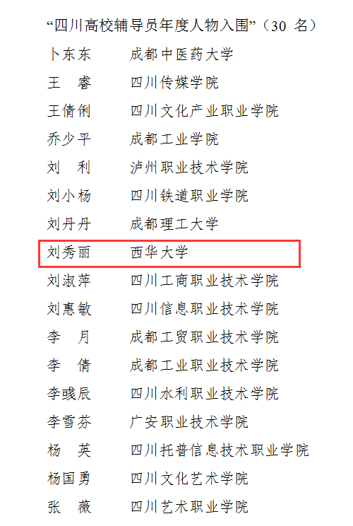 近日,由四川省委教育工委、教育厅与省委宣传部组织开展2023年思政工作“年度人物”推选展示活动落下帷幕,本次活动共遴选出“四川高校辅导员年度人物”10名、“四川高校辅导员年度人物提名”20名、“四川高校辅导员年度人物入围”30 名。我校管理学院辅导员刘波荣获“四川高校辅导员年度人物提名”、电子与信息工程学院辅导员刘秀丽荣获为“四川高校辅导员年度人物入围”。