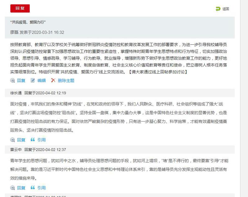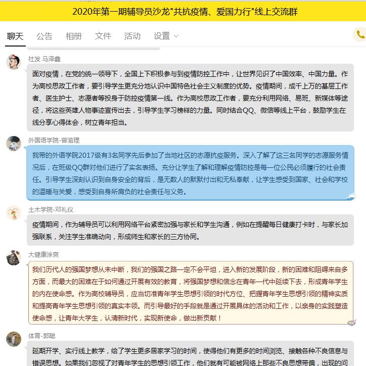 在线上主题交流会上,各学院辅导员结合自身工作实际,积极思考,踊跃发言,畅谈疫情期间的工作做法和工作感悟。