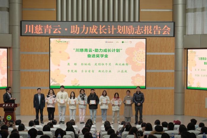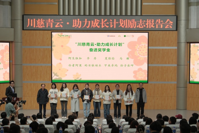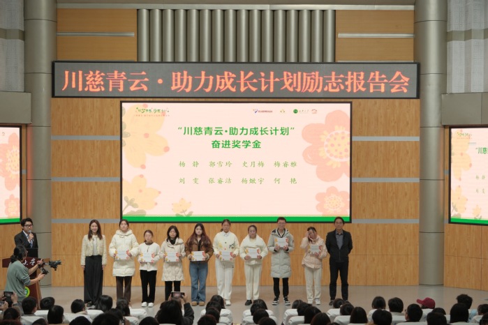 报告会现场,与会领导和嘉宾为优秀的受助学生颁发了“川慈青云·助力成长计划”奋进奖学金,并向2024年公益慈善活动优秀团队颁发了荣誉证书。