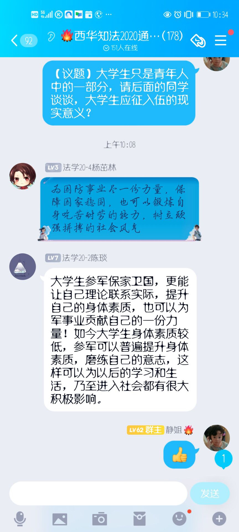 2019级知识产权学院、法学院学生:对于自身来说大学生参军不仅丰富个人经历,更是磨砺了个人坚强意志,培养了爱国精神。对社会来说,大学生是朝气蓬勃的群体,大学生参军易让社会整体形成参军风气,为国防建设打下坚实基础。对国家来说,有利于进一步改善兵源素质结构,加强国防现代化建设。