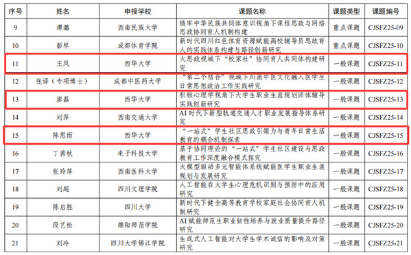 近日,四川省教育厅正式公布了2025年思想政治教育研究课题(高校辅导员专项)立项结果。经学校申报、专家评审,全省共立项115项。我校在此次课题申报中表现突出,共有三项课题成功获批立项,涵盖“大思政”视域下的协同育人、积极心理学应用以及“一站式”学生社区建设等前沿方向,这些课题紧扣时代脉搏,聚焦当前高校思想政治教育工作中的重点与难点问题,具有重要的理论价值和现实意义,充分展示了我校辅导员队伍扎实的理论功底和积极的实践探索精神。