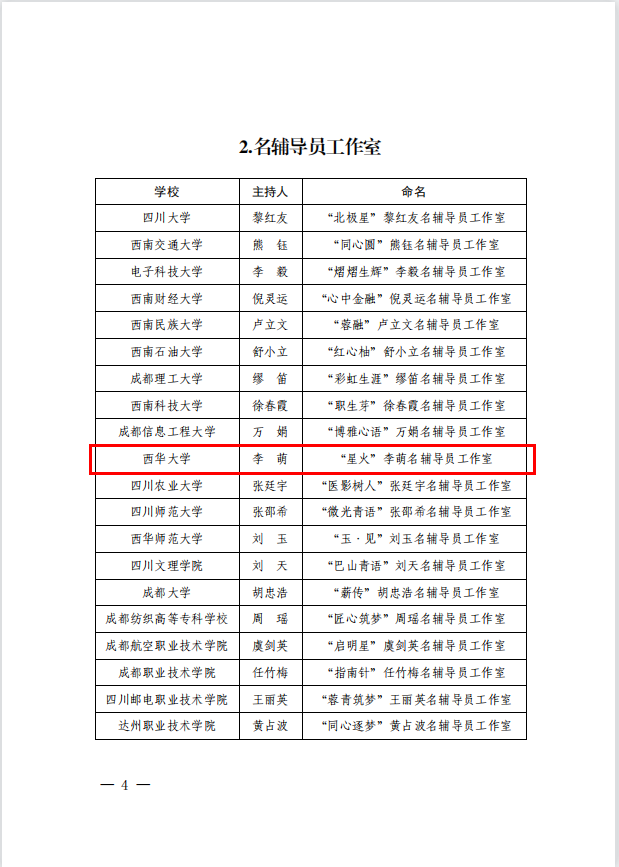 近日,中共四川省委教育工委、四川省教育厅公布了高校思想政治教育名师工作室名单(2021-2025年第1批)我校辅导员李萌申报的辅导员工作室成功入选