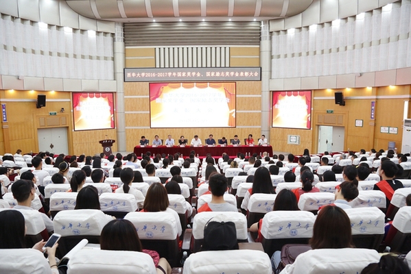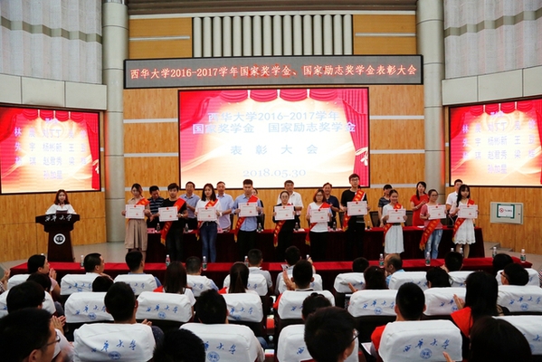 大会在庄严的国歌声中拉开帷幕。学生工作部部长王大清宣读了bevictor伟德2016—2017学年研究生国家奖学金、本专科生国家奖学金、国家励志奖学金表彰文件及获奖学生名单。我校裴迎举等37名研究生获得了2016-2017学年研究生国家奖学金,蹇可佩等62名本专科学生获得2016-2017学年度本专科生国家奖学金,曾欢等1430名学生获得2016-2017学年国家励志奖学金。与会领导分别为获得研究生国家奖学金、本专科生国家奖学金、国家励志奖学金获奖学生代表颁发了荣誉证书。