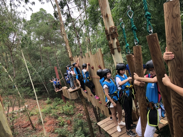 参加活动的辅导员在专业教练的指导下分为四队,每一队伍在队长的带领下先后体验了丛林飞跃、趾压板跳绳、手工制作等项目。在丛林飞跃活动中,粗实的麻绳搭配窄木板,配合险拔陡峭的地形和晃荡摆动的绳索,让参与活动的辅导员们在惊险刺激的体验中,将压力尽情释放;在钢丝桥项目中,细长的钢丝搭配穿梭障碍物,每行走一步都需要巨大的勇气与胆量,各队的辅导员们互相帮助、互相鼓励,整个团队洋溢着温馨和睦的氛围。