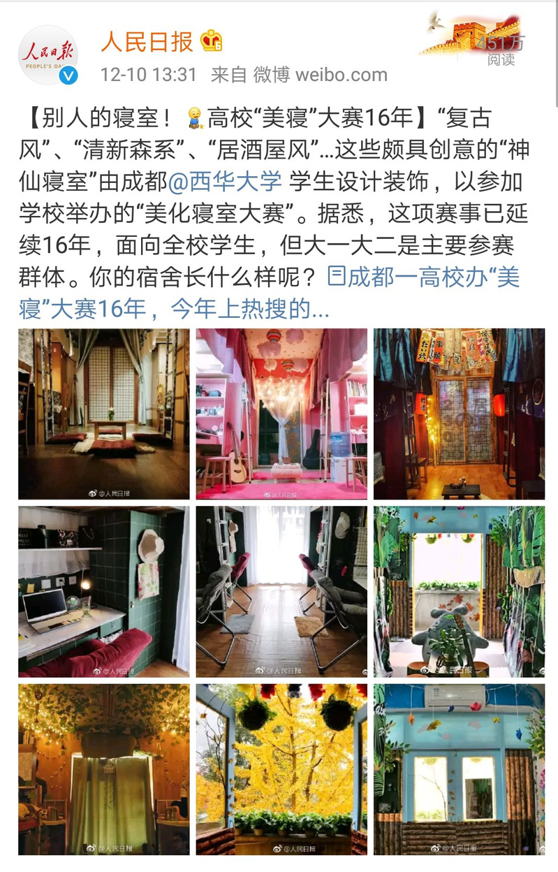 据悉,此次美寝大赛学生不仅踊跃参与,还获得多家媒体宣传报道,在网络引起热议。部分特色寝室被34家媒体编辑转发,其中包括“人民日报”“新华网”“四川共青团”等权威媒体,话题阅读讨论25万余次。“居酒屋”寝室更是登上12月9日微博时实热搜第18名,话题讨论量达30万余次。为扩大美寝大赛影响力,学校利用易班平台开展“美寝上易班”特色版块进行美寝展示,并进行易班投票,参与投票人数达9529余人次,投票数达81292。